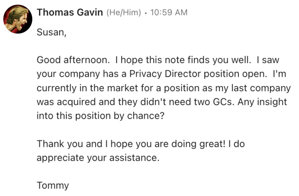 A director position at a major bank caught his eye. Not his dream, but at this point, worth a look. He noticed a former colleague on the team and reached out. One LinkedIn message later, they were catching up over a video call.