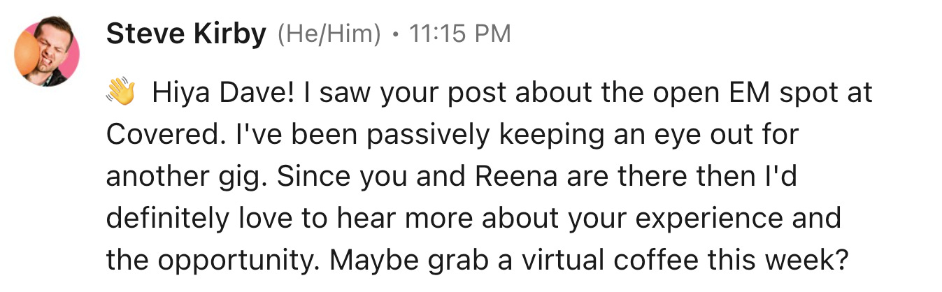 I grab my first cup of coffee, saunter into my office, and log on, fully expecting just another day of Slack messages and status meetings. Then my bossâs boss pings me: âGot time for a quick chat?â